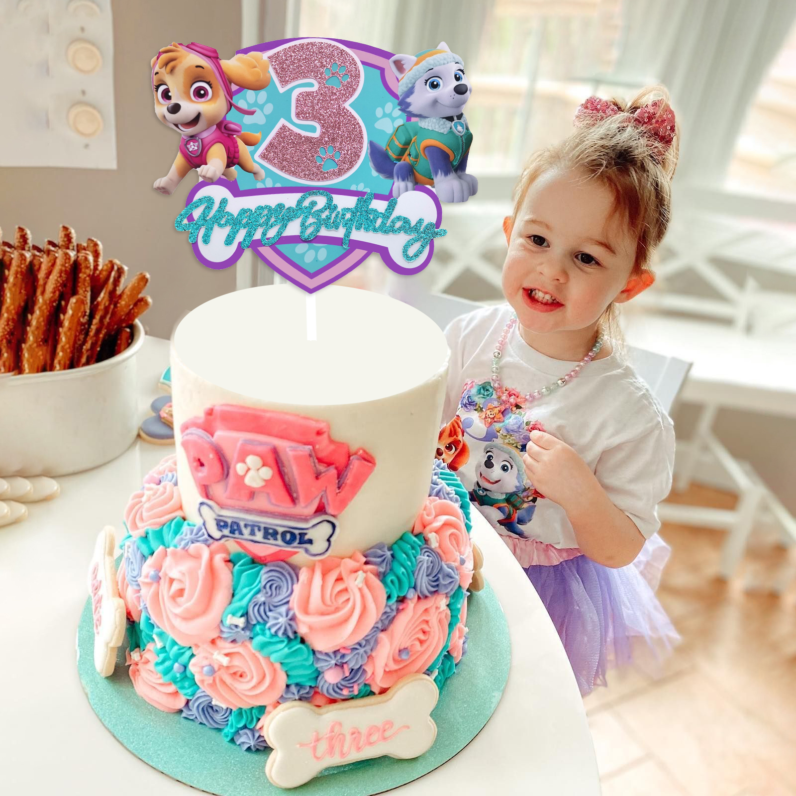 Paw Patrol 3th Birthday Cake Decoration - Glitter Number 3 Topper with Skye, Everest & Lookout Tower, Kids Themed Party Supplies